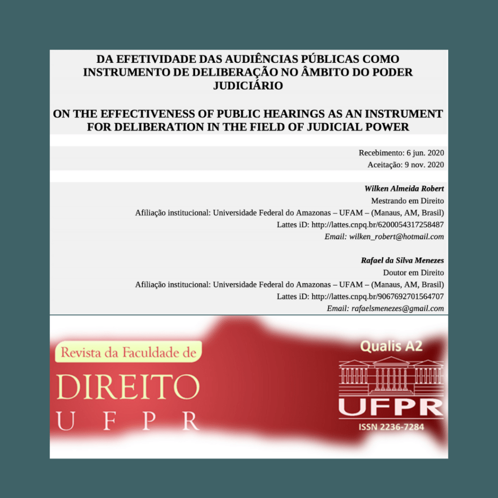 Com esse enfoque, a Revista da Faculdade de Direito UFPR (Qualis A2) publicou, hoje, artigo escrito a quatro mãos, por Wilken Robert e por mim Rafael Menezes, sobre a efetividade das Audiências Públicas no Poder Judiciário, descortinando algumas de suas premissas, promessas e contingências.