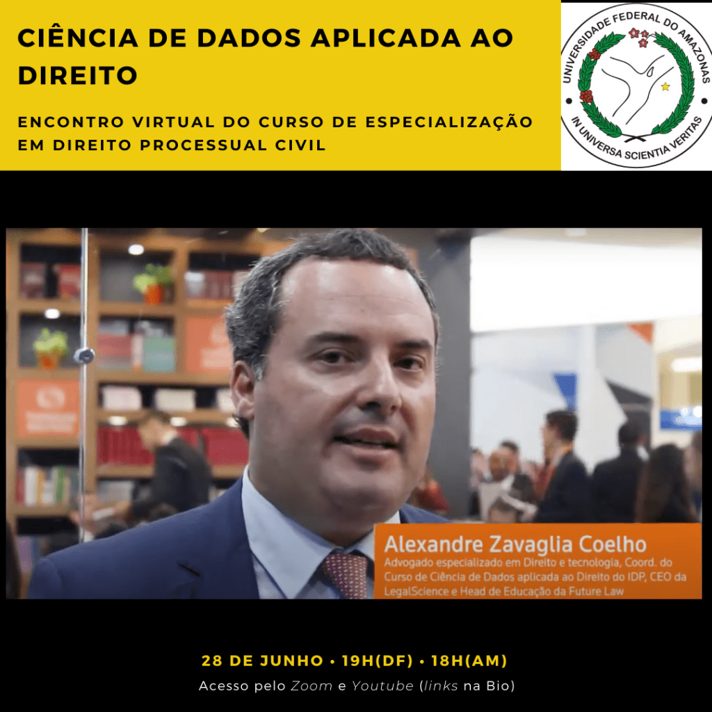 No dia 28 de junho (segunda-feira), às 18h (AM) e 19h (DF), receberemos o Professor Alexandre Zavaglia Coelho, para participar de Encontro Virtual no Curso de Especialização em Direito Processual Civil da UFAM, sobre tema cada vez mais impactante no tratamento eficiente de controvérsias de natureza jurídica: Ciência de Dados aplicada ao Direito.
