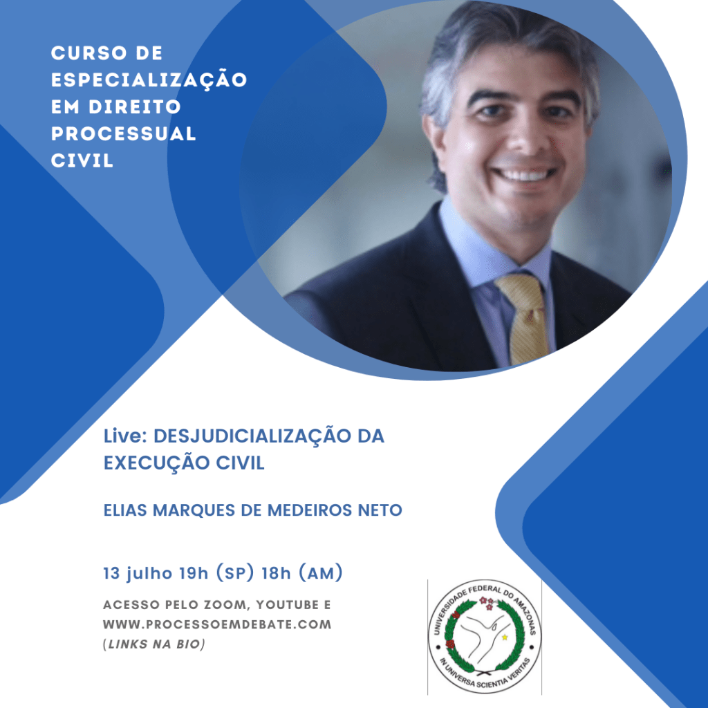 Na próxima terça-feira, 12/07, às 19h (SP) e 18h (AM), receberemos o Professor Elias Marques de Medeiros Neto, em Encontro Virtual do Curso de Especialização em Direito Processual Civil, para abordar o tema DESJUDICIALIZAÇÃO DA EXECUÇÃO CIVIL.